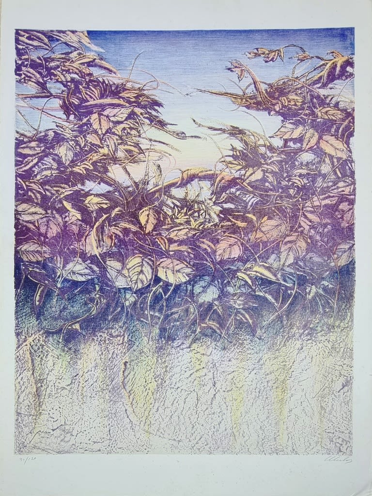 MULAS FRANCO Roma 1938 – 2023 "Minerale vegetale" Litografia cm 50×70, del 1978. Firmata sul fronte in basso a destra, tiratura 98/120 a sinistra. Sul retro timbro di garanzia a cura di Edizione d’arte Contini.