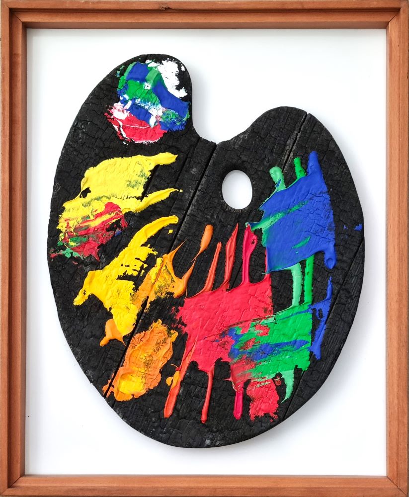 CAVELLINI GUGLIELMO ACHILLE Brescia 1914 – 1990 "Carbone bruciato" Tavolozza in carbone bruciato, colori e tempere, in cornice di legno cm 44×54, del 1970. Sul retro timbro a secco a cura dell’Archivio Storico Cavellini. Archiviazione a cura dell’Archivio Cavellini, certificato di autenticità a cura di Vimarte.