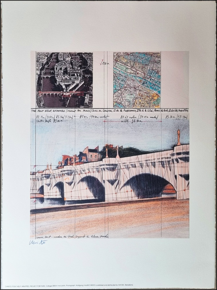 CHRISTO JAVACEV Bulgaria 1935 – New York 2020 "Project for Pont Neuf Wrapped" Cromolitografia cm 56×76 del 2003. Firmata sul fronte in basso a sinistra, tiratura 350 cx come da certificato di autenticità a cura della Grafica d’Arte Lombardi.