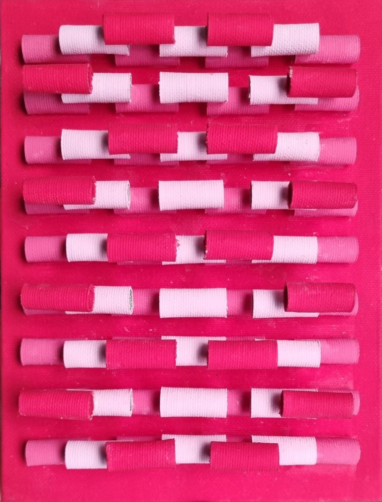 FASANO FRANCESCO Fasano 1966 "Risvolti" Tele arrotolate sovrapposte su pannello cm 15×20, del 2018. Al verso firma, titolo, data, tecnica e misure.