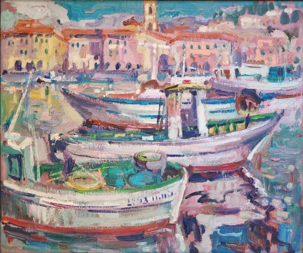 GALLO BEPPE Asti 1942 "Barche a Oneglia" Olio su tela cm 60×50 del 2001. Firmato sul fronte in basso a destra. Al verso titolo, firma e anno. Dichiarazione di autenticità dell’Artista e archivio a cura di MeetingArt.