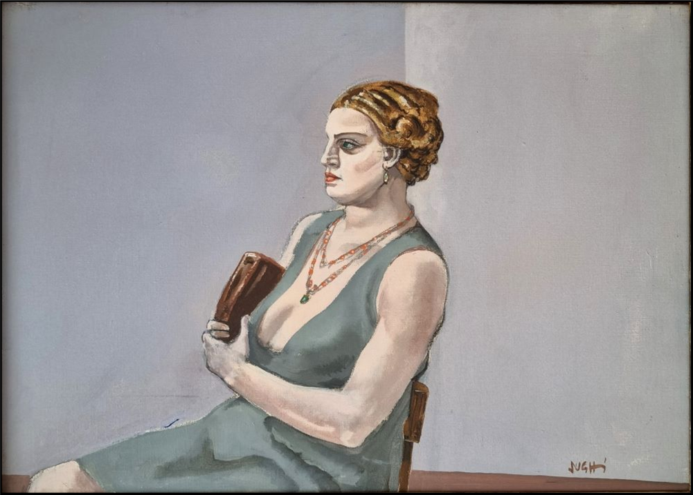 SUGHI ALBERTO Cesena 1928 – Bologna 2012 "L’attesa" Olio e tecnica mista su tela cm 70×50 del 1976/77. Firmato sul fronte in basso a destra, intitolato al verso. Autentica su foto a cura della Galleria L’Immagine (Arezzo).
