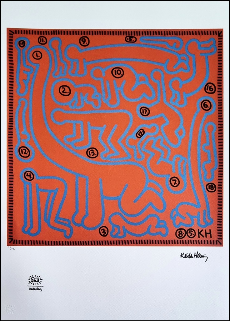 HARING KEITH Pennsylvania 1958 – New York 1990 "Senza titolo" Riproduzione litografica offset cm 50×70. Firma in stampa sul fronte in basso a destra, tiratura, timbro a secco e timbro in stampa a sinistra.