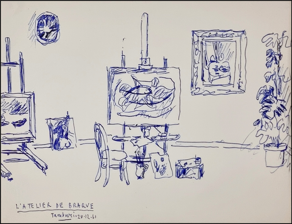 TAMBURI ORFEO Jesi 1910 – Parigi 1994 "L’atelier de braque" Penna su cartoncino cm 27×20 del 1961 corredata da passepartout. Intitolata, firmata e datata sul fronte in basso a sinistra. Autentica su foto a cura dell’Artista.