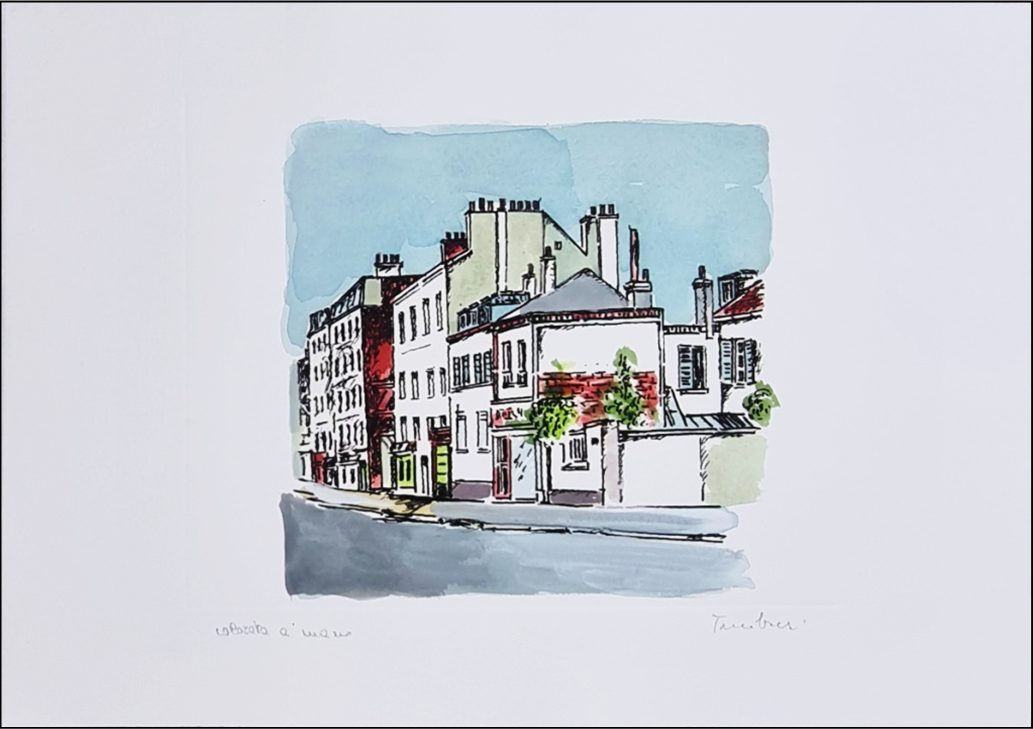 TAMBURI ORFEO Jesi 1910 – Parigi 1994 "Senza titolo" Incisione serigrafica acquerellata a mano, su carta pregiata, cm 50×35, pezzo unico. Firmata sul fronte in basso a destra, dicitura "ritoccata a mano" a sinistra.