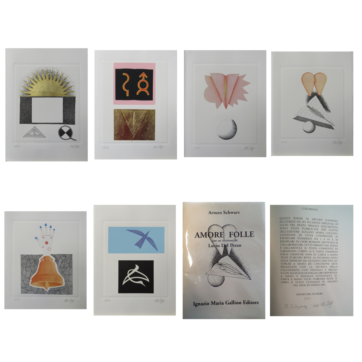 DEL PEZZO LUCIO Napoli 1933 – Milano 2020 "Libro d’autore – Amore folle" Libro contenente poesie di Arturo Schwarz, illustrate da sei incisioni originali del Maestro, cm 28×38, tutte firmate. Esemplare XXII.