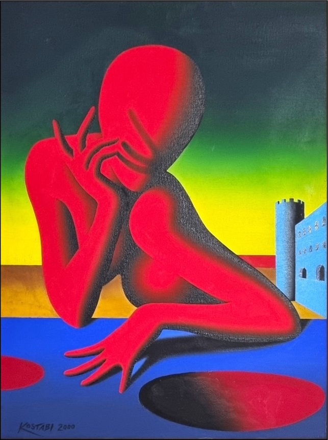 KOSTABI MARK Los Angeles 1960 "The whole truth" Olio su tela cm 46×61 del 2000. Firmato e datato sul fronte in basso a sinistra. Al verso firma, titolo, data e numero d’archivio. Certificato di autenticità con numero d’archivio a cura di Kostabi World.