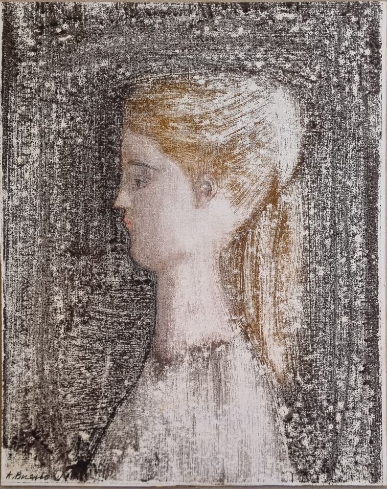 BUENO ANTONIO Berlino 1918 – Fiesole 1984 "Profilo di giovane" Olio su carta riportata su tavola cm 40×50 del 1970. Firmato sul fronte in basso a sinistra. Al verso etichetta Contempoarte (Firenze), titolo e anno. Archivio su foto a cura dell’Archivio Fotografico Generale delle opere di Antonio Bueno.