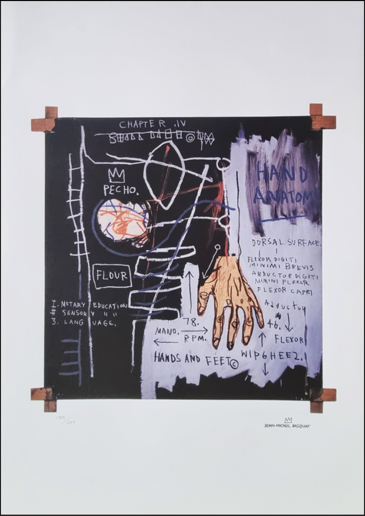 BASQUIAT JEAN-MICHEL BASQUIAT JEAN-MICHEL New York 1960 - 1988 "Senza titolo" Riproduzione litografica offset cm 70x50. Firma in stampa sul fronte in basso a destra, tiratura 200/250 e timbro a secco a sinistra. |
