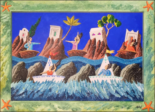 APHEL FABIO Cavalese (TN) 1957 “Per mare” Olio su tavola cm 70×50. Firmato sul fronte in basso a destra. Sul retro titolo, firma e dimensioni.