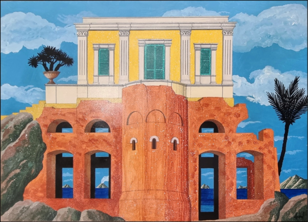 APHEL FABIO Cavalese (TN) 1957 “La palazzina” Olio su tavola cm 70×50. Firmato sul fronte in basso a destra. Sul retro titolo, firma e dimensioni.