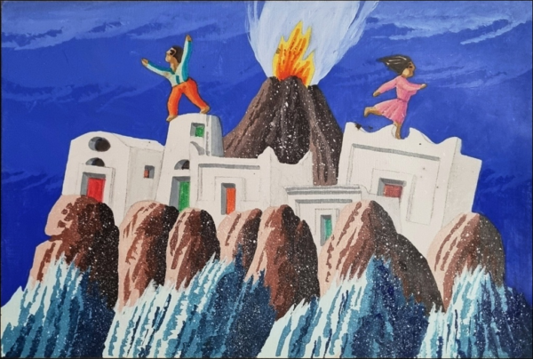 APHEL FABIO Cavalese (TN) 1957 “L’eruzione” Olio su tavola cm 30×20. Sul retro intitolato e firmato.