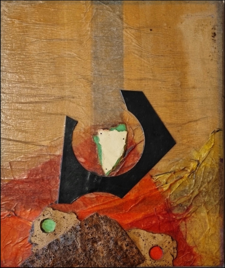 CRIPPA ROBERTO Monza 1921 – Bresso 1972 “Senza titolo” Acrilici, tecnica mista e sugheri applicati su tavola cm 37,5×43,5. Firmata al verso. Autentica ed archiviazione su foto a cura di Roberto Crippa Jr.
