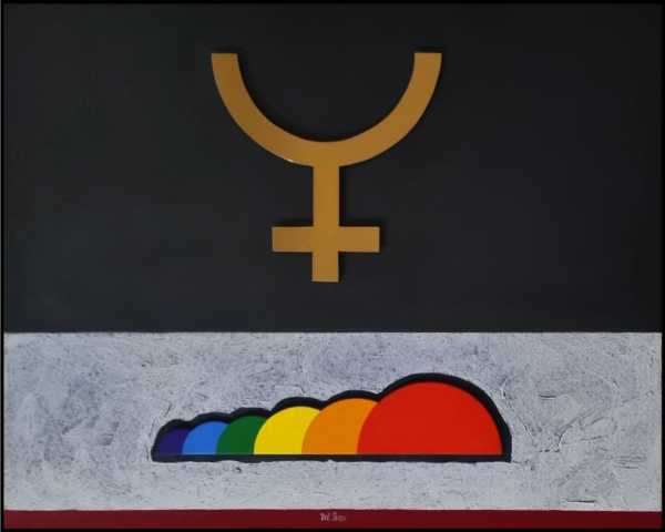 DEL PEZZO LUCIO Napoli 1933 – Milano 2020 “Segno alchemico” Colore acrilico, collage, grafite e ottone dorato su legno, cm 75×60. Firmato sul fronte in basso al centro. Sul retro titolo, firma, tecnica e misure. Autentica su foto a cura dell’Artista.