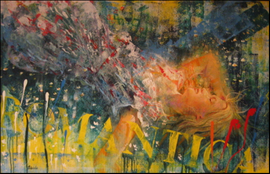 DELVECCHIO MAURIZIO Basilea 1962 “Romantica” Olio su tela cm 110×70. Firmato sul fronte in basso a sinistra. Autentica su foto del Maestro.