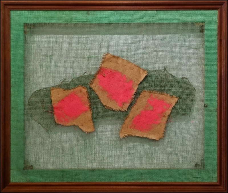 EMBLEMA SALVATORE Terzigno 1929 – 2006 “Senza titolo” Terra colorata su tela di juta cm 120×100 del 2005. Firmata e datata al retro. Autentica su foto con numero d’archivio a cura dell’Archivio Emblema.