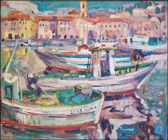 GALLO BEPPE Asti 1942 “Barche a Oneglia” Olio su tela cm 60×50 del 2001. Firmato sul fronte in basso a destra. Al verso titolo, firma e anno. Dichiarazione di autenticità dell’Artista e archivio a cura di MeetingArt.