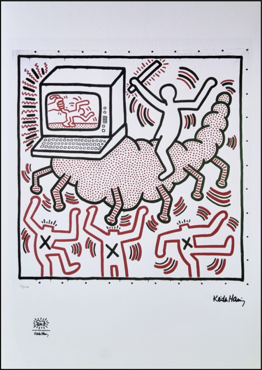 HARING KEITH Pennsylvania 1958 – New York 1990 “Senza titolo” Riproduzione litografica offset cm 50×70. Firma in stampa sul fronte in basso a destra, tiratura 57/150, timbro a secco e timbro in stampa a sinistra.