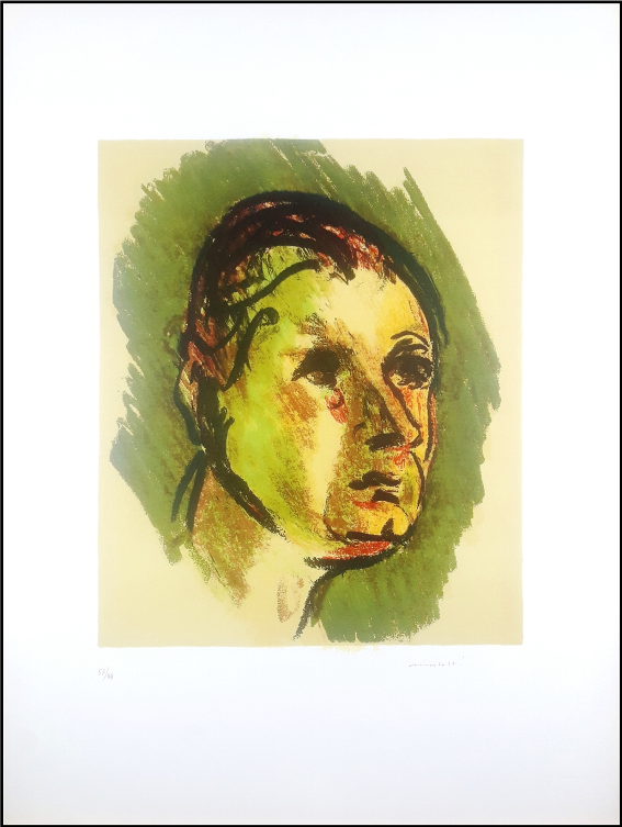 MORLOTTI ENNIO Lecco 1910 – Milano 1992 “Autoritratto” Litografia su cartoncino cm 48×63 del 1977. Timbro a secco e firma a matita sul fronte in basso a destra, tiratura 57/99 a sinistra.