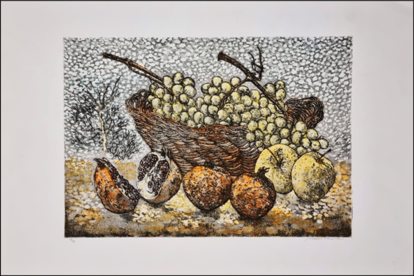 MOSCA MARIO Osimo (AN) 1940 “Natura morta” Acquatinta acquerellata a mano, cm 49×34 del 1981. Firmata sul fronte in basso a destra, tiratura 58/99 a sinistra. Certificato di autenticità a cura di Edizioni d’Arte Angolare.