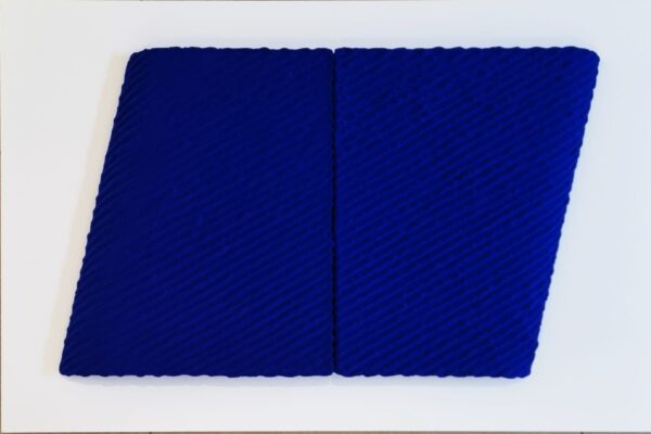PINELLI PINO Catania 1938 – 2024 “Pittura BI” Acrilico e tecnica mista su due elementi cm 70×45, applicati su tavola in legno cm 90×60, del 2019. Contenuti in teca di plexiglass. Al verso del primo elemento titolo, data, misure e firma. Autentica ed archiviazione su foto a cura dell’Archivio Pino Pinelli.