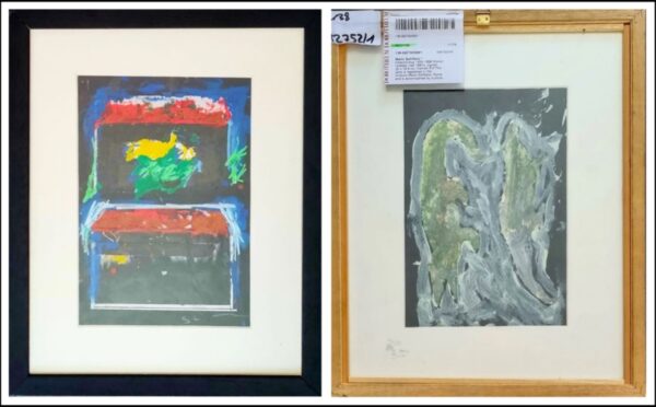 SCHIFANO MARIO Libia 1934 – Roma 1998 “Senza titolo” Acrilico, pennarelli e collage su cartoncino cm 17×25 (dipinto fronte/retro) della prima metà degli anni ’90. Firmato sul fronte in basso a destra. Certificato di autenticità ed archiviazione a cura di Monica Schifano.