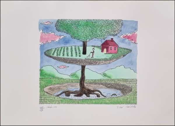 SCHULER MARCO Germania 1972 “Il campo” Incisione su cartoncino colorata a mano cm 70×50. Intitolata e firmata sul fronte in basso a destra, tiratura XXVII/XXX e dicitura “colorata a mano” a sinistra.