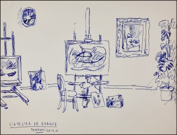TAMBURI ORFEO Jesi 1910 – Parigi 1994 “L’atelier de braque” Penna su cartoncino cm 27×20 del 1961 corredata da passepartout. Intitolata, firmata e datata sul fronte in basso a sinistra. Autentica su foto a cura dell’Artista.