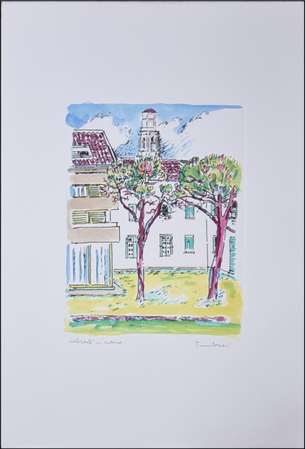 TAMBURI ORFEO Jesi 1910 – Parigi 1994 “Senza titolo” Incisione serigrafica acquerellata a mano, su carta pregiata, cm 35×50, pezzo unico. Firmata sul fronte in basso a destra, dicitura “ritoccata a mano” a sinistra.